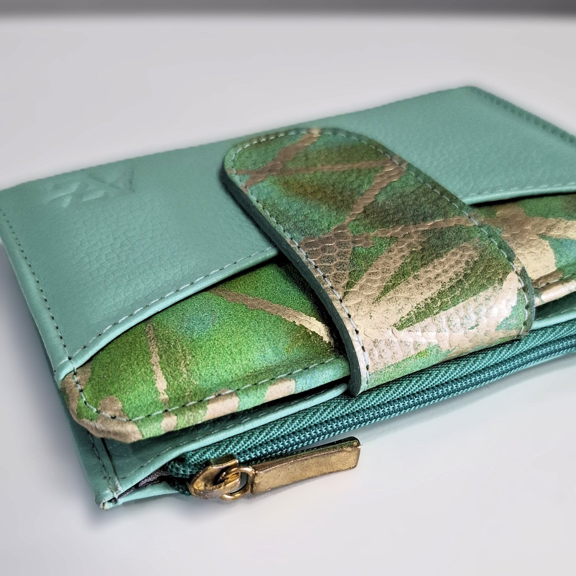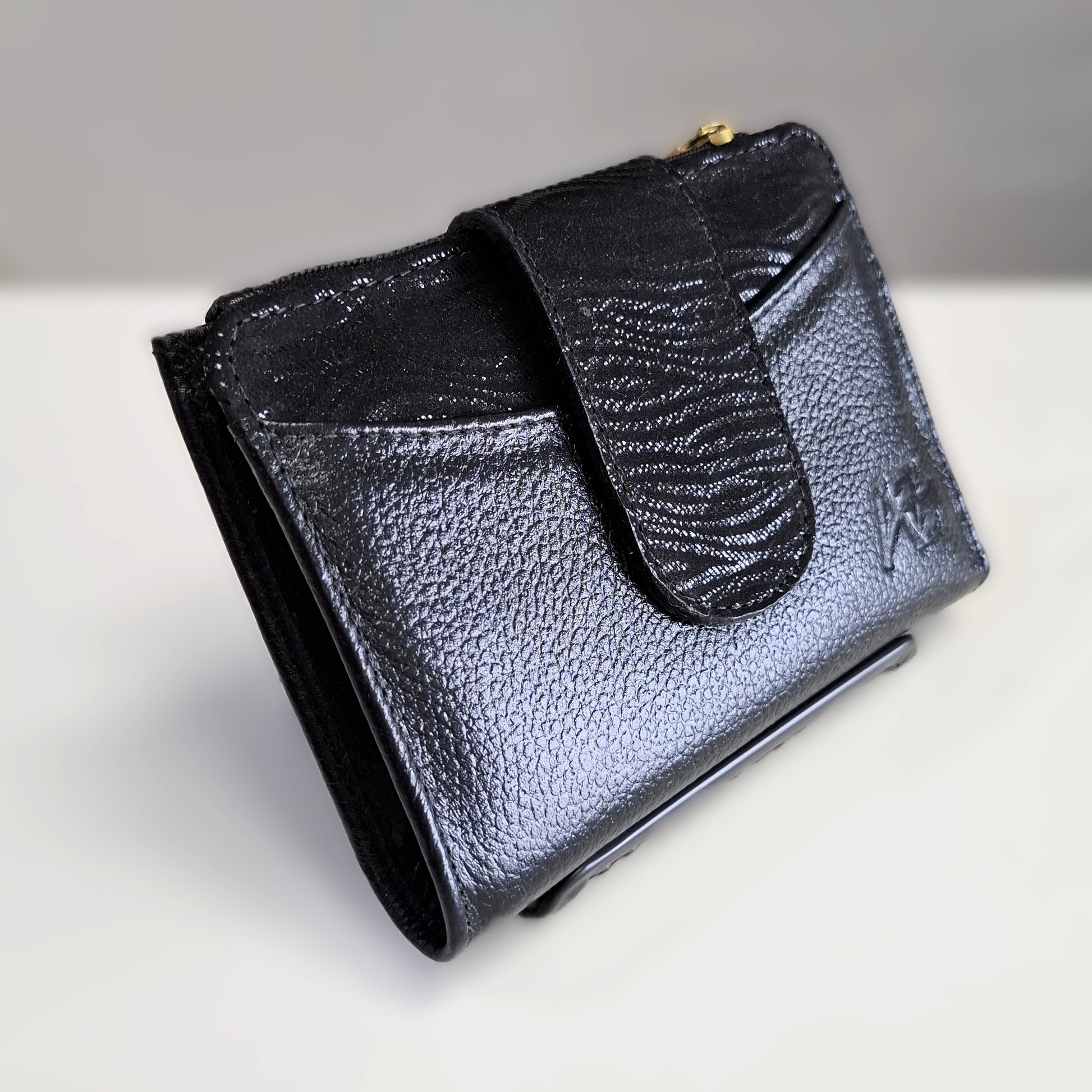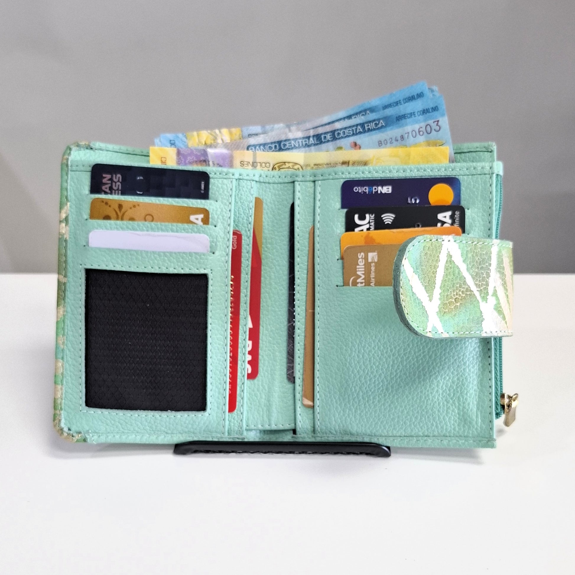 Su interior revela un diseño cuidadosamente distribuido:7 espacios para tarjetas, 1 compartimento para billetes, 4 espacios para documentos y un monedero con cierre de broche que mantiene todo seguro y en orden.