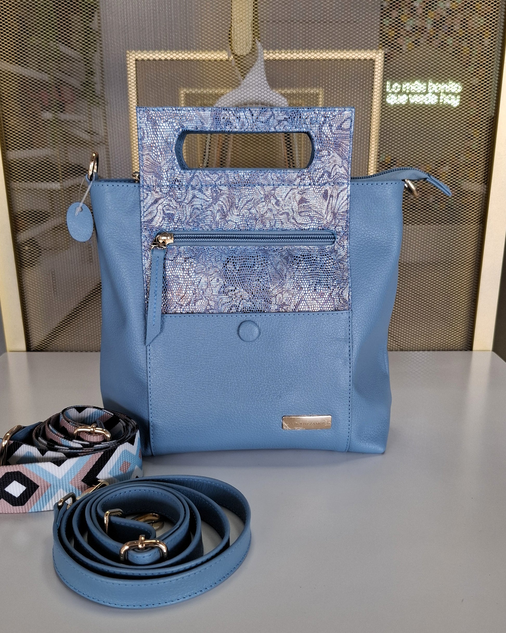 Cuenta con doble asa, una de cuero y otra de tela, que permiten llevarlo de mano o al hombro según la ocasión.