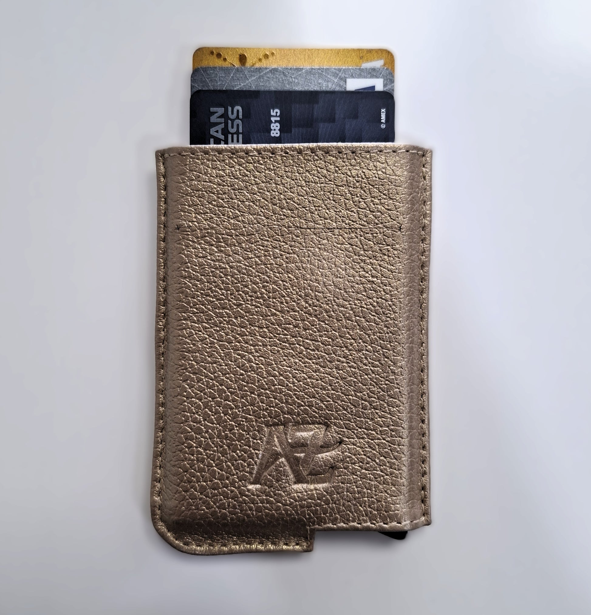 El Tarjetero Automático Metálico combina una estructura de aluminio resistente con una cubierta en cuero 100 % genuino, reflejando elegancia moderna y calidad artesanal.